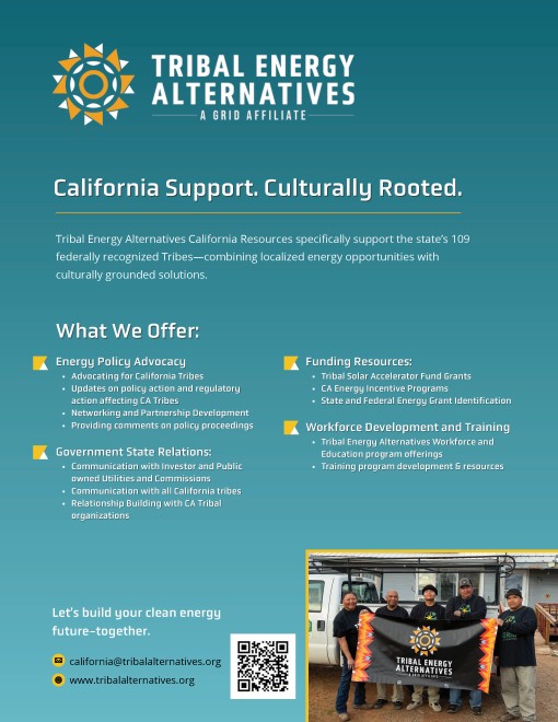 Tribal Energy Alternatives (TEA) centers on expanding access to renewable energy for Native American communities throughout California by partnering with Tribal Nations. Our resources and opportunities help implement solar energy projects and other renewable energy projects that not only reduce energy costs but also support sustainability and energy independence for tribal members. Tribal Energy Alternatives remains committed to increasing energy resilience through community-driven solutions. The organization will work with tribes to design and implement solar energy installations, provide workforce training programs, and advocate for policies that support Tribal energy sovereignty. TEA aims to honor tribal sovereignty, cultural values, and renewable energy goals while promoting environmental justice through listening, planning, funding support, and implementation.